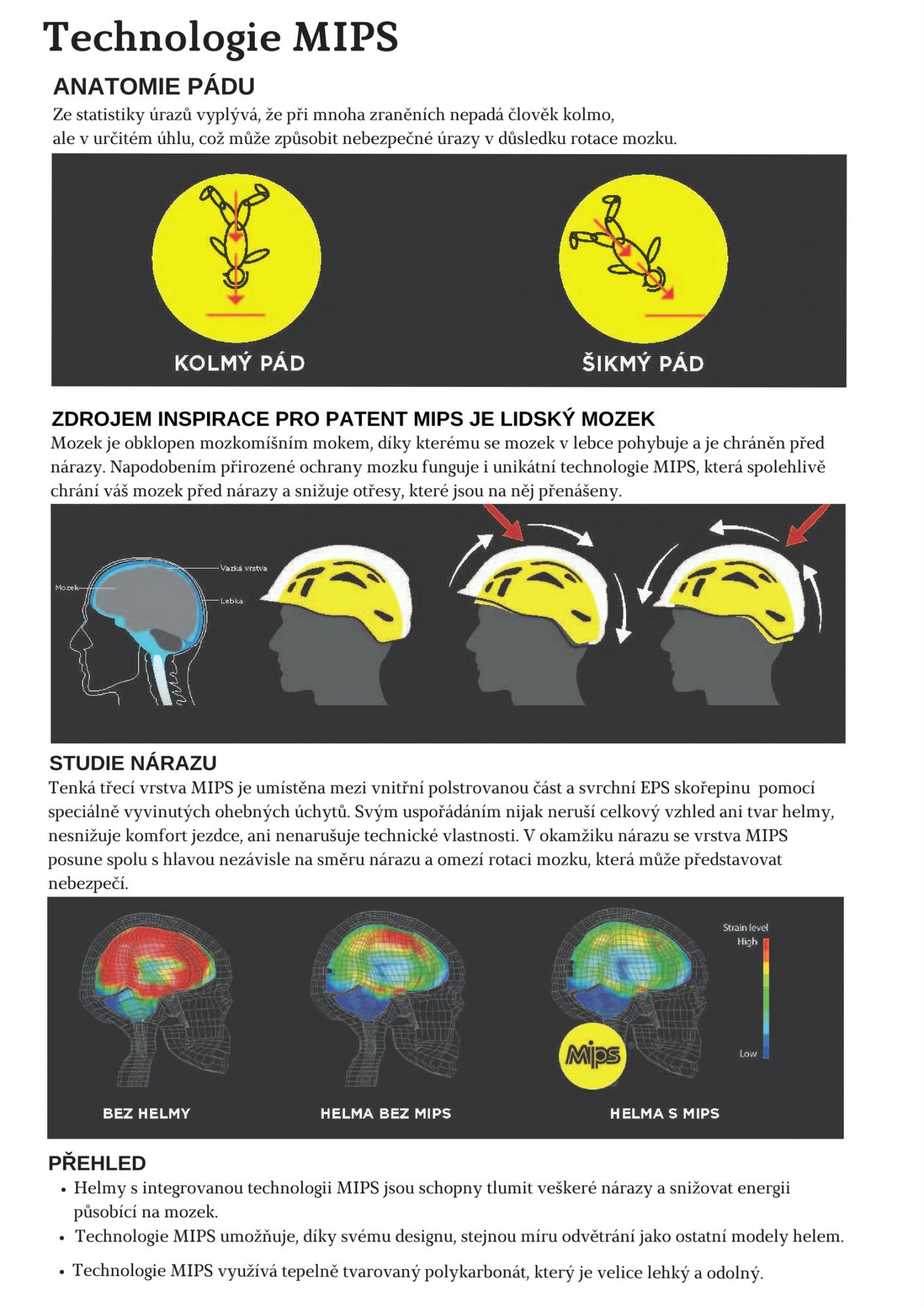 MIPS: Mezi výplní a skořápkou je umístěn tenký ochranný plát, který nijak nenarušuje celkový vzhled ani tvar helmy ani nesnižuje komfort při nošení. V okamžiku nárazu se vrstva MIPS posune spolu s hlavou nezávisle na směru nárazu a omezí rotaci mozku, která může představovat velké nebezpečí. Foto k popisu technologie naleznete mezi obrázky k produktu.