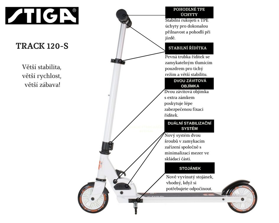 Sportovní koloběžka Track 120-S je vyrobená švédskou firmou STIGA, která je již od roku 1957 známá vysokou kvalitou svých výrobků a zakládá si na precizním zpracování i toho nejmenšího detailu.